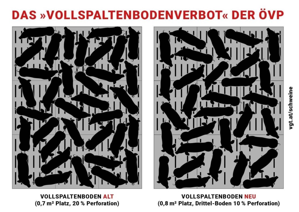 Deshalb hat der VGT die Situation der Schweine auf Vollspaltenboden bereits 2019 ins Rampenlicht der Öffentlichkeit gebracht, die der Mastrinder 2023. Tatsache ist, dass Schweine nach wie vor auf Vollspaltenboden leiden, ohne Stroh, auf hartem Beton. Immerhin betrifft es 70% der Schweine in Österreich, also rund 3.000.000 Tiere, also 6.000.000 pro Jahr, da diese bedauernswerten Geschöpfe nur ein halbes Jahr zu leben haben. Dann kommt die neue Generation. Der harte Beton ist schlecht für ihre Gelenke. Die Ausdünstungen der Exkremente, über denen sie ihr ganzes kurzes Leben verbringen, führen zu Atemwegserkrankungen und Augenentzündungen. Darüber hinaus ist diesen intelligenten Tieren schlicht langweilig, so dass sie anfangen, sich gegenseitig anzuknabbern. 25% der so gehaltenen Tiere überleben diese Tortur nicht einmal bis zur Schlachtreife. Man könnte auch anders sagen, ein Viertel dieser Tiere leidet für den Mülleimer. Nun wurde ein Aus für den Vollspaltenboden in Aussicht gestellt, mit dem Jahr 2040, denn sonst wäre zu große Unsicherheit gewesen. Auf Initiative des Landes Burgenland wurde eine Verfassungsklage dagegen eingebracht und siehe da, der Verfassungsgerichtshof gab den Klagenden recht und befand die Übergangsfrist für zu lange. Nun muss der Vollspaltenboden bis 2025 abgeschafft werden. Die Protagonist*innen, die aus dem Schweineleid Profit schlagen und sich auf eine ruhige, 17 Jahre dauernde Übergangsfrist eingerichtet hatten, schreckten hoch und taten, was sie immer tun, sie zeigten sich erschrocken und malten Horrorszenarien.