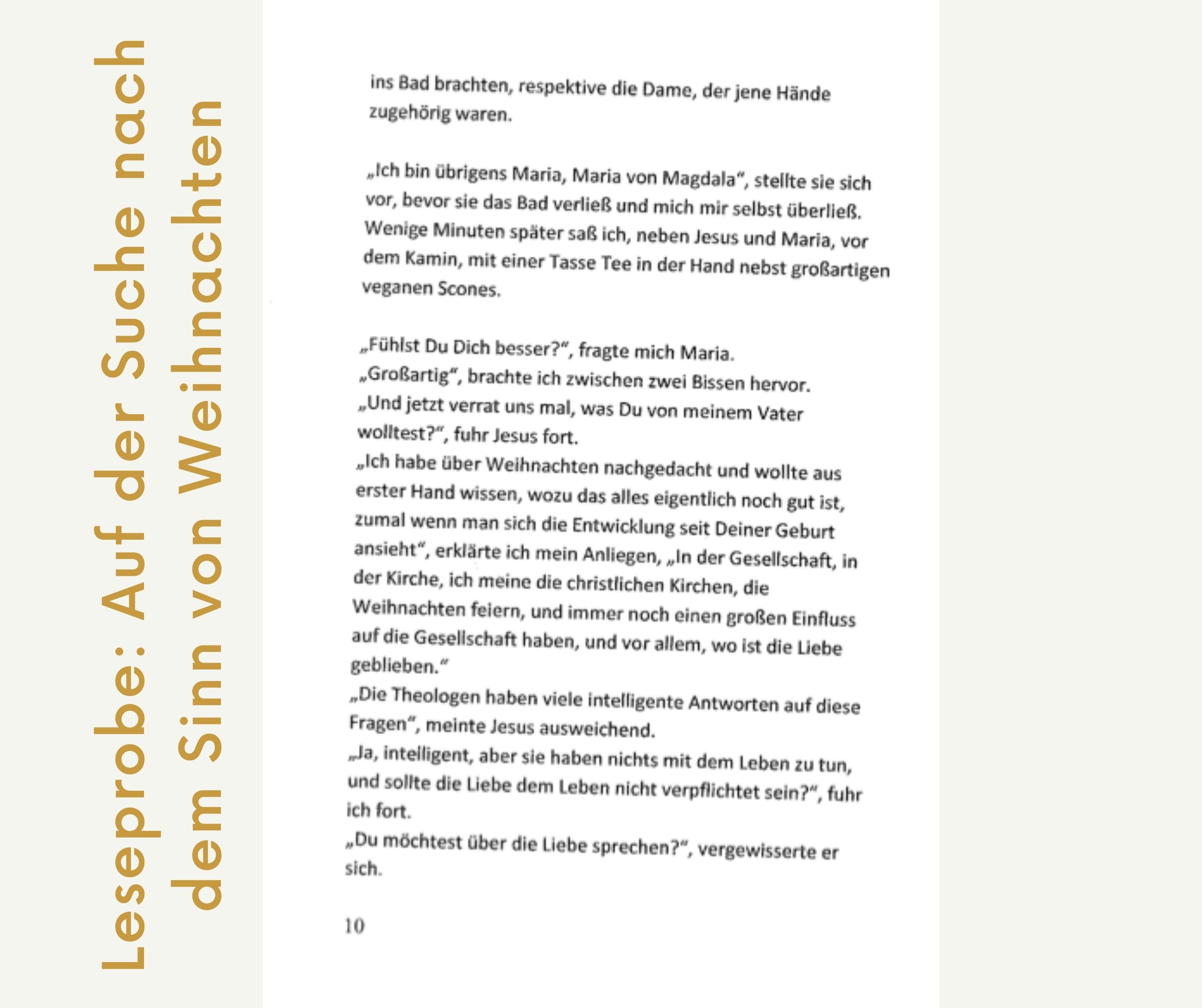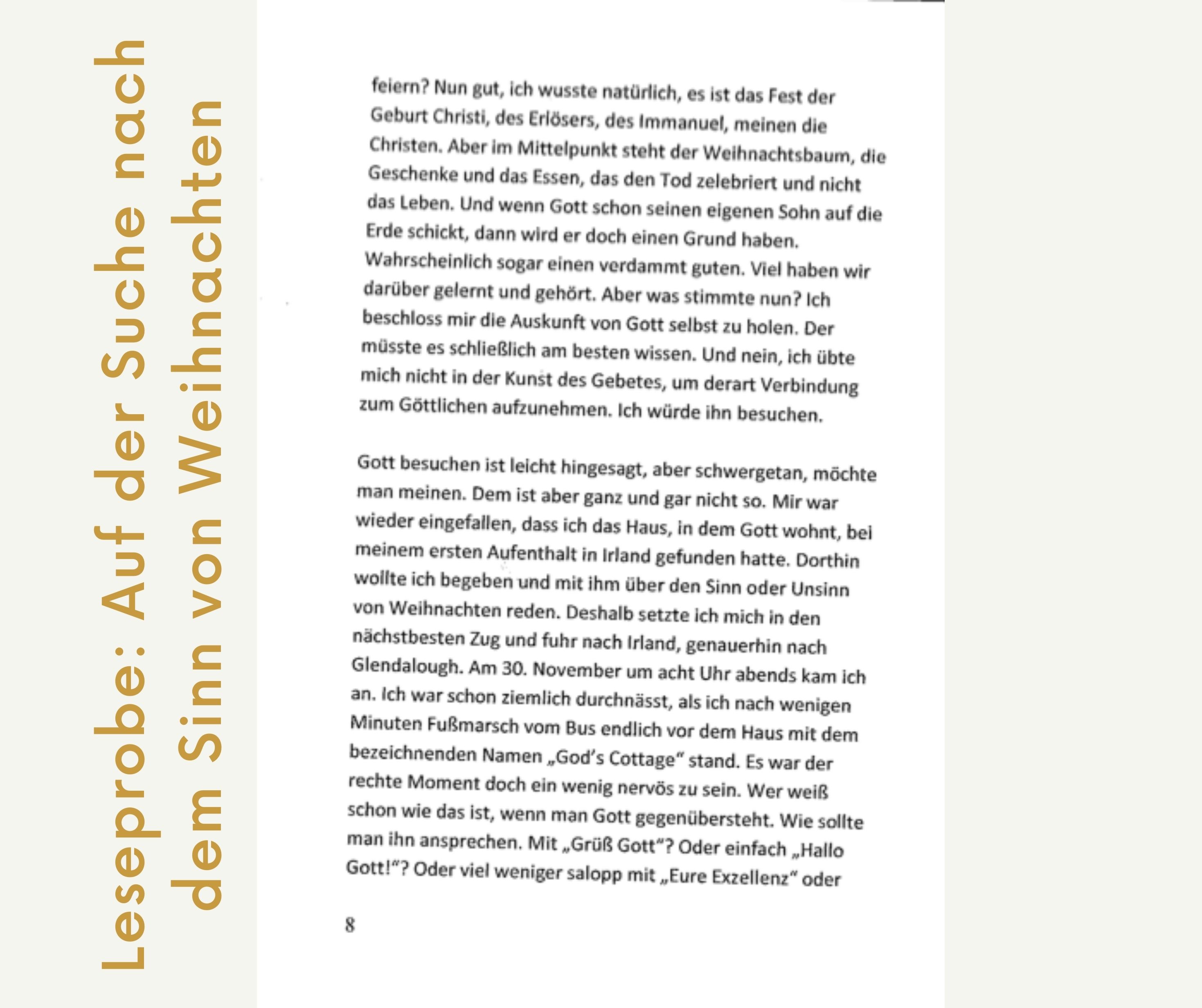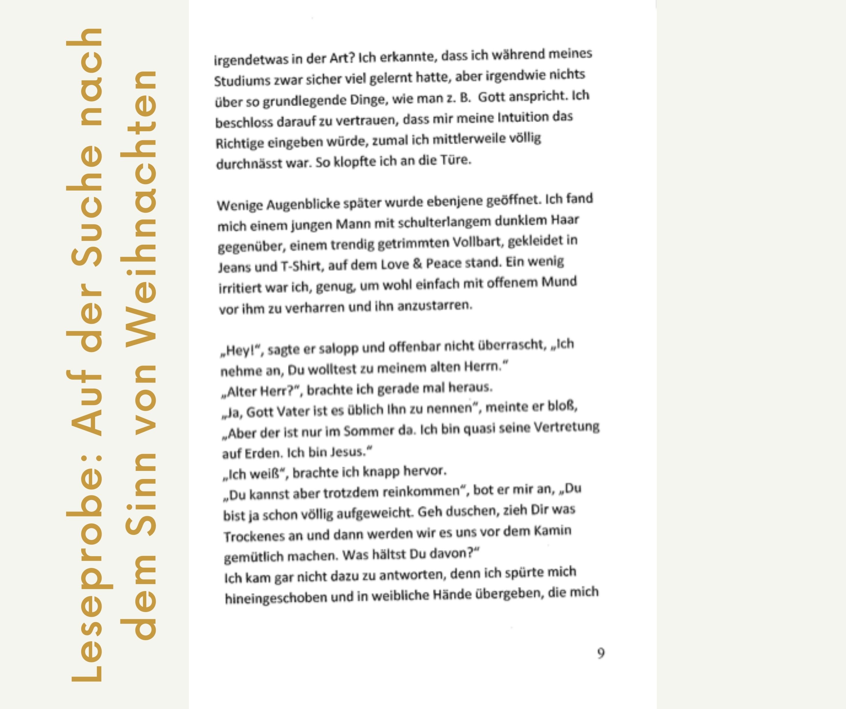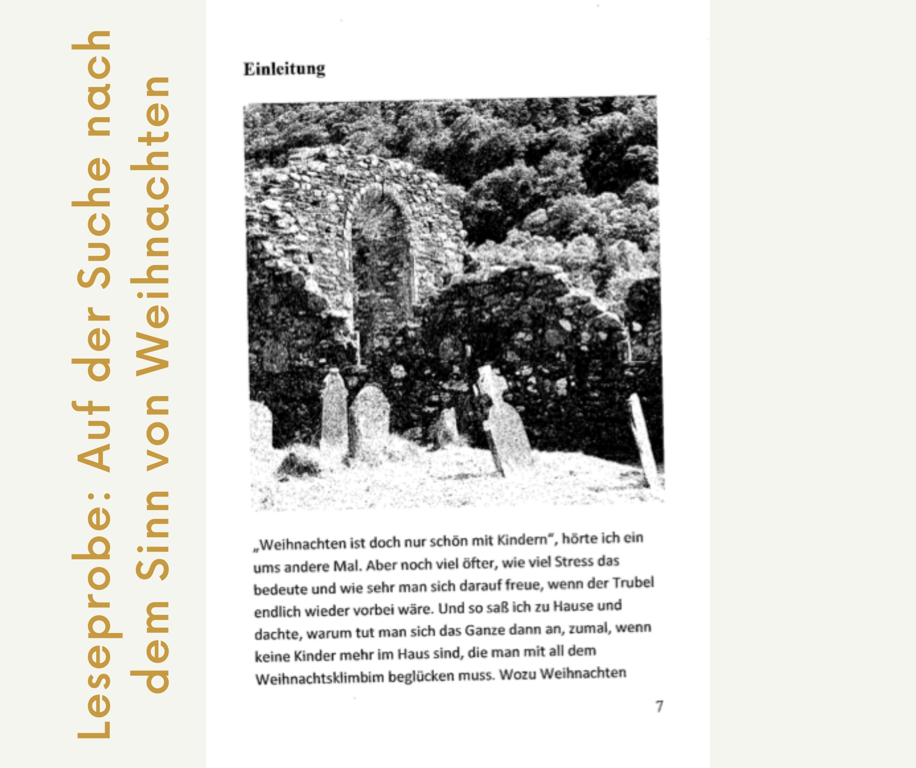 Auf der Suche nach dem Sinn von Weihnachten ist ein Buch über eine Entdeckung. Weihnachten, das ist Stress und Hektik und Streit, stellt die Ich-Erzählerin fest. Doch kann das wirklich der Sinn sein? Sie beschließt sich diese Frage von dem beantworten zu lassen, der es am ehesten kann, Gott persönlich, denn sie weiß wo er wohnt. In einem kleinen Cottage in Irland. Leider ist Gott nicht zu Hause, aber Maria von Magdala und Jesus von Nazareth findet sie in besagtem Cottage vor. So verbringt sie die 24 Tage des Advent im intensiven Gespräch über den Sinn von Weihnachten. Die verschiedensten Aspekte des Lebens werden beleuchtet. Die Ich-Erzählerin findet etwas, was sie schon lange nicht mehr erlebt hat. Ruhe. Geborgenheit. Miteinander. Aber was hat das alles mit dem Sinn zu tun? Wird sie den eigentlichen Sinn noch finden?