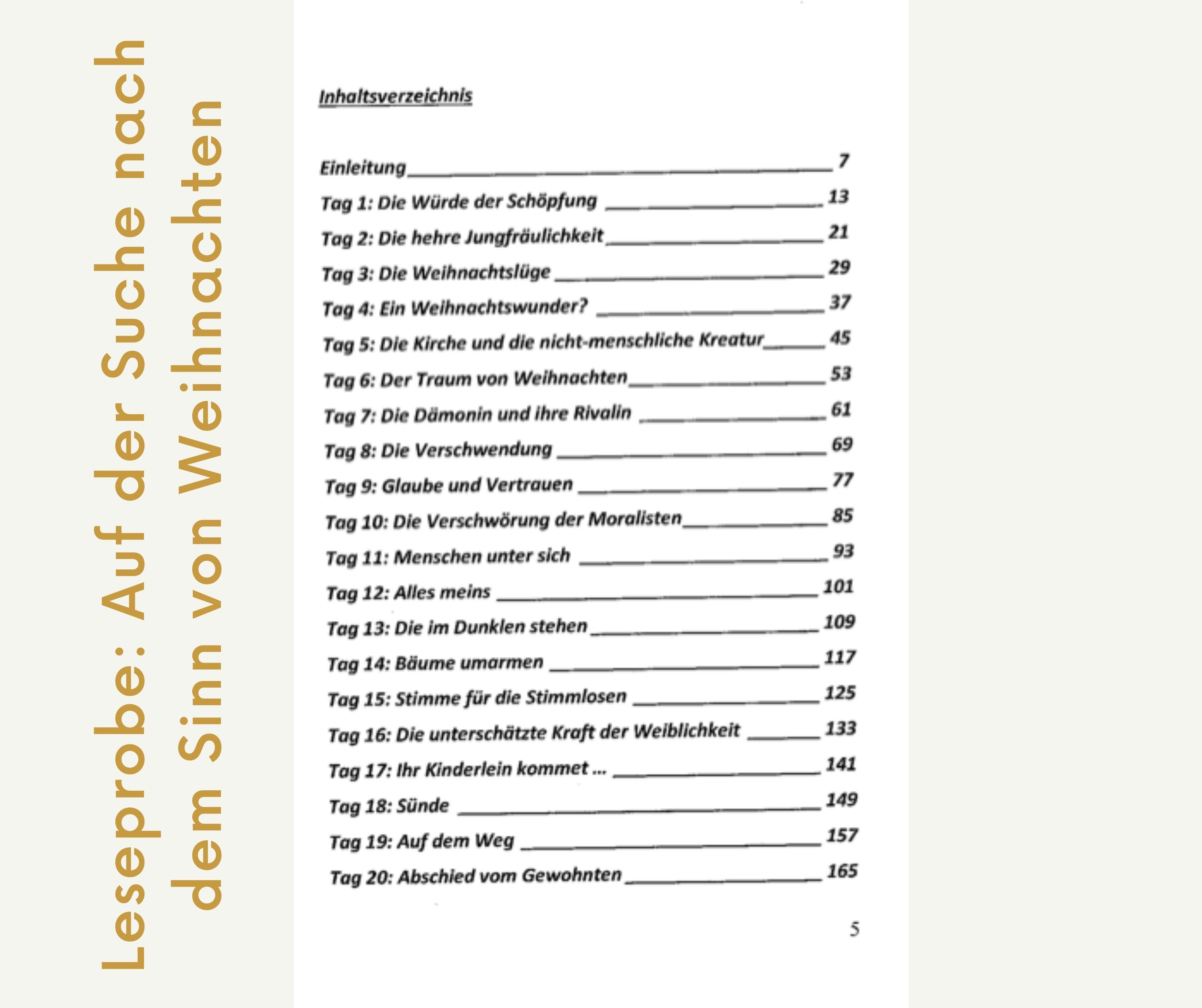 Auf der Suche nach dem Sinn von Weihnachten sollten wir eigentlich alle sein, alle, die dieses Fest feiern. Doch nicht beschränkt auf den 24 Dezember, sondern schon die Zeit davor, die für alle als besinnlich gilt. Besinnlichkeit wird auch durch ein Adventkalenderbuch wie dieses unterstützt. Ungefähr 10 min dauert es, um eine Geschichte für den jeweiligen Tag zu lesen. 10 min, die man sich zurückziehen kann und für sich sein kann und einen Anstoß zu dem findet, worum es in der Zeit wirklich geht. Lasst Euch mitnehmen auf eine etwas ungewöhnliche Reise. Es kann beflügelt und erweiternd wirken, verzaubern und belebend. Wärme und Geborgenheit, für alle, die auf der Suche sind, für alle, die sich noch nicht ganz von den Belanglosigkeiten und Belastungen begraben ließen, für alle, die offen sind für das Leben. Lasst Euch ein, auf etwas Außergewöhnliches, das letztlich eigentlich alltäglich sein sollte, ein gelungenes Miteinander.