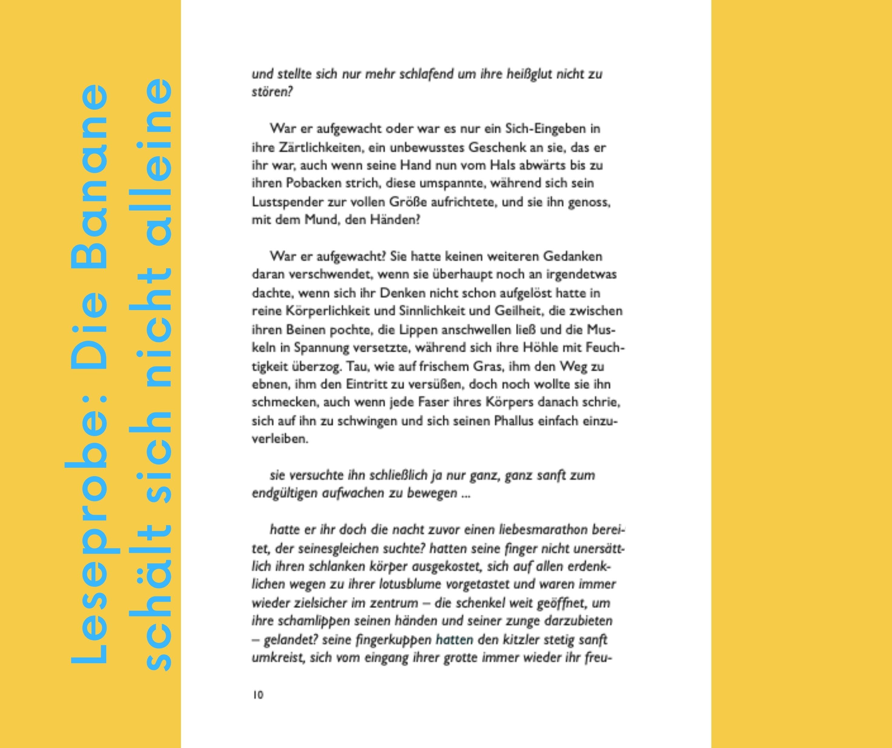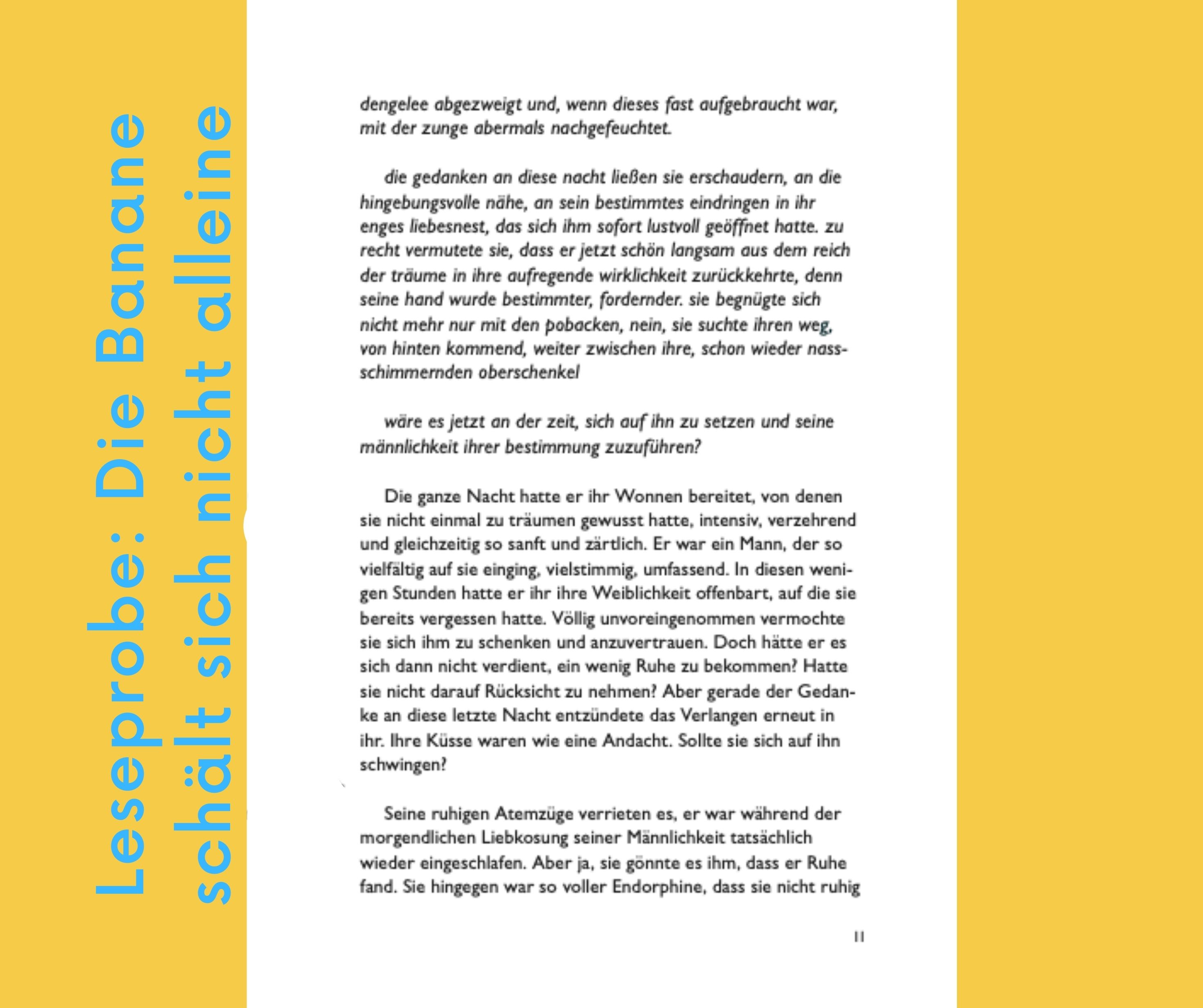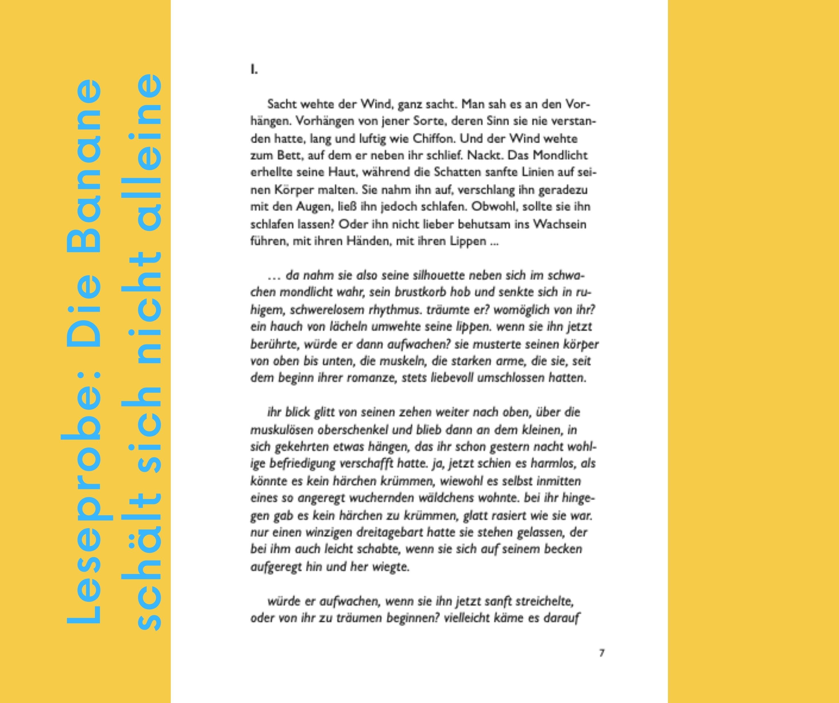 „Die Banane schält sich nicht alleine“ erzählt die Geschichte einer erotischen Begegnung. In aller Schlichtheit, die die Besonderheit dieser einen Begegnung zum Ausdruck bringt. Gerade in dieser Besonderheit kann sie aber auch Verbindlichkeit beanspruchen. Denn in ihrem bewussten Verzicht auf alle Künstlichkeit, kristallisieren sich die verbindenden Elemente dessen heraus, was eine gelungene Begegnung sein kann. Auch und gerade in diesem Bereich. Respekt, Achtsamkeit, Zugewandt sein gehören dazu, und spiegeln sich im Umgang der Protagonisten. Dies spiegelt sich auch in der Art der literarischen Umsetzung. Durchgehend kommen beide Stimmen zu Wort, gleichberechtigt und offen. Ein heterosexuelles Paar, das sich in seiner Körperlichkeit findet, und doch weit darüber hinaus geht. Alles ganz normal, möchte man meinen. Und doch ist es gerade in dieser scheinbaren Normalität, ein Buch des Widerstandes, ein Stein des Anstoßes und ein Plädoyer für die Freiheit.