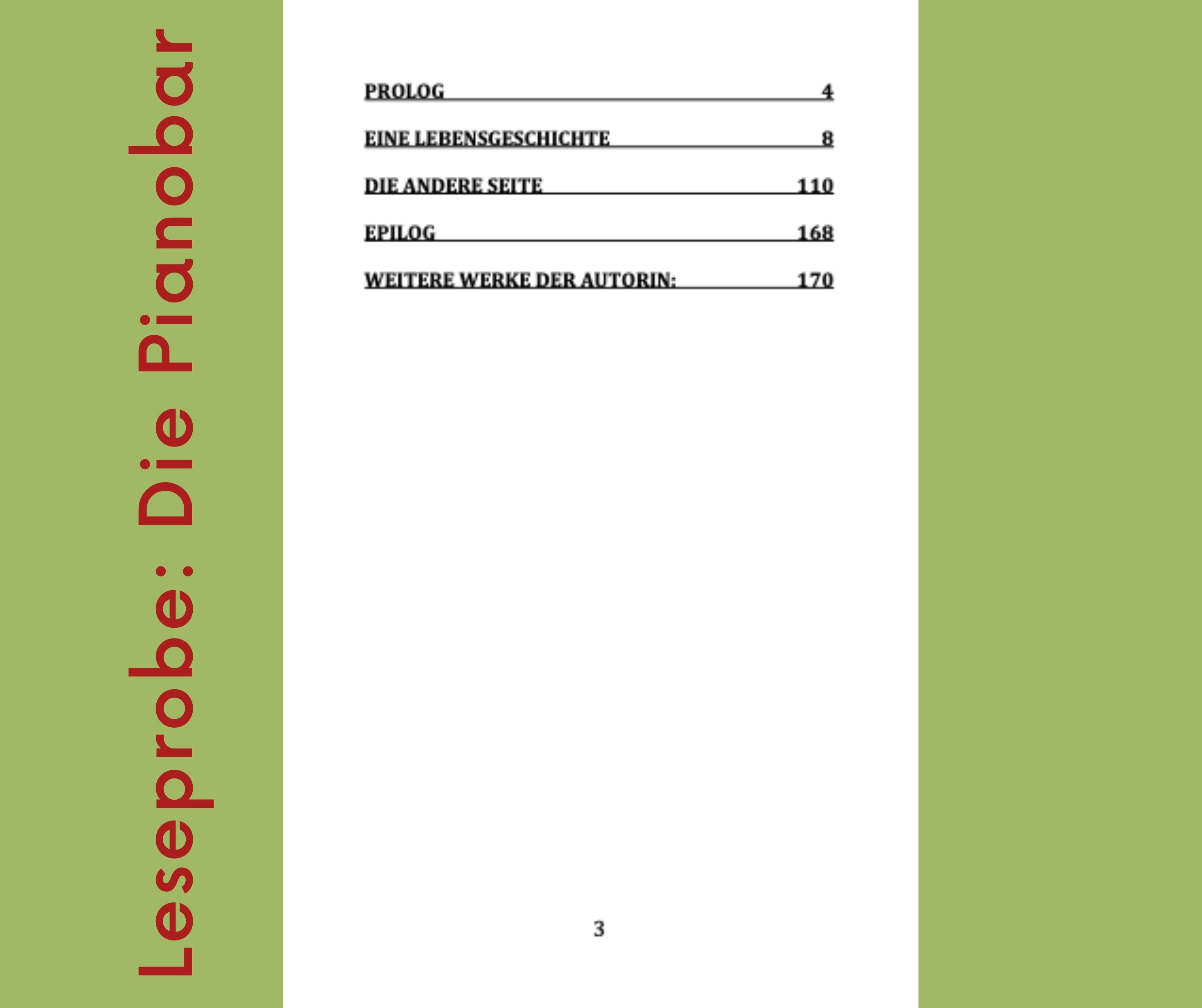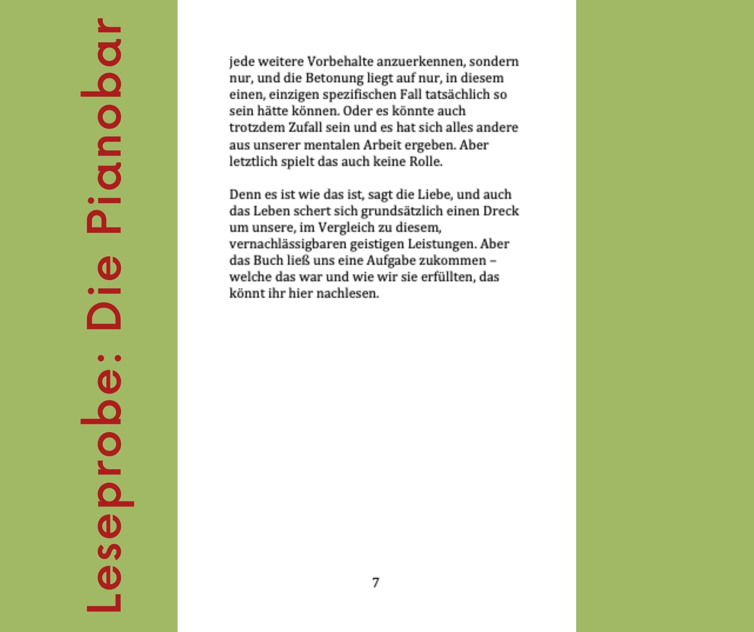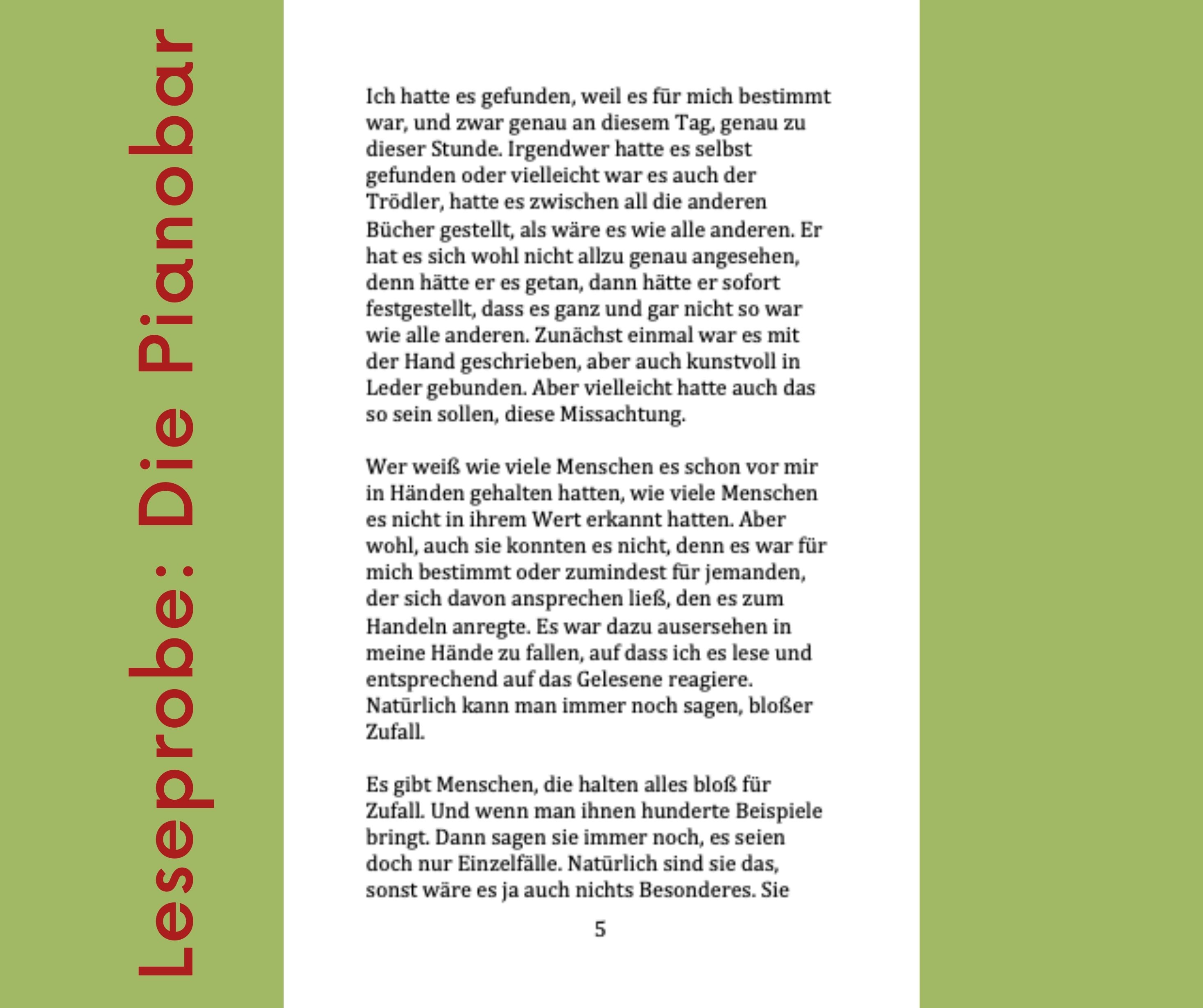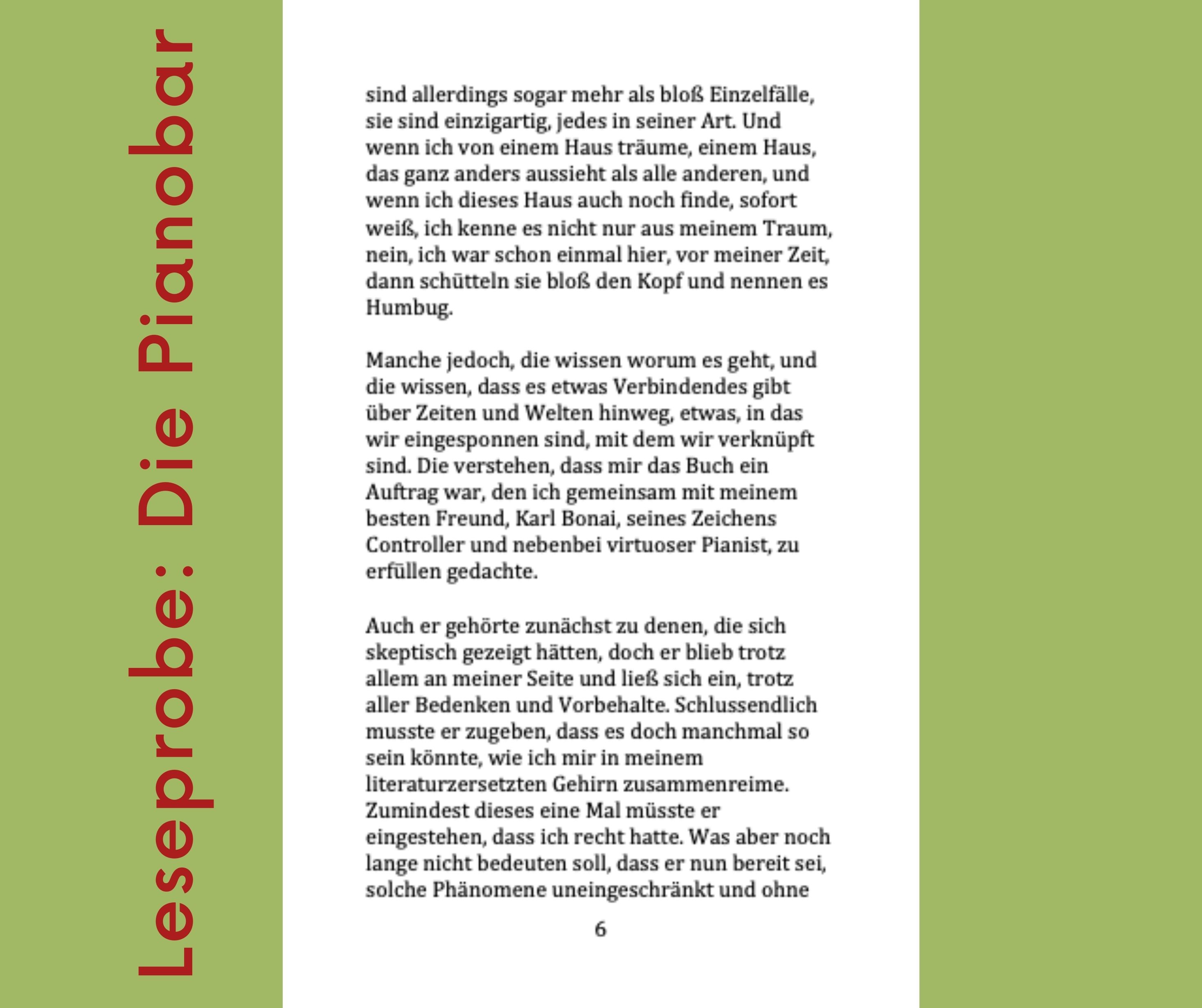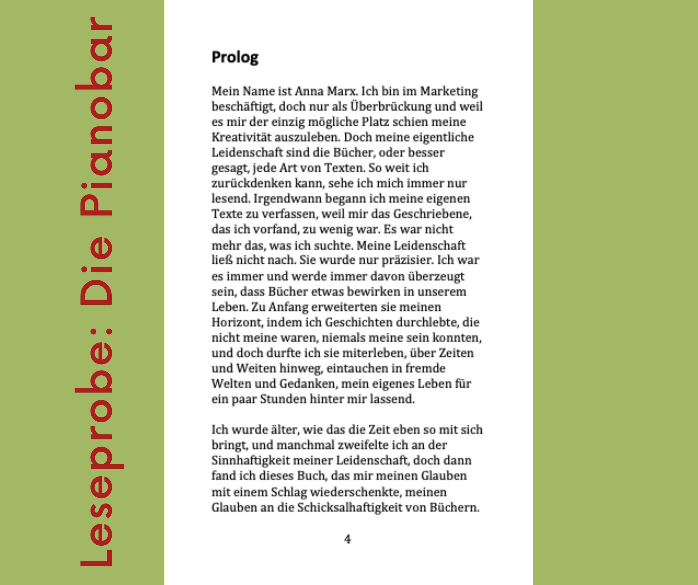 Die Pianobar ist eine Novele, die damit beginnt, dass Anna Marx bei einem Trödler ein altes Tagebuch findet. Immer schon war Anna Marx davon überzeugt, dass Bücher ihr Leben verändern würden, als ihr eines Tages bei einem ihrer Streifzüge ein Buch in die Hände fällt, das ein ganz besonderes Geheimnis beherbergt. Es ist handschriftlich verfasst und erzählt eine ganz außergewöhnliche Lebensgeschichte. Anna Marx liest Karl Bonai, ihrem besten Freund das Buch vor. Sie will damit nicht alleine bleiben.