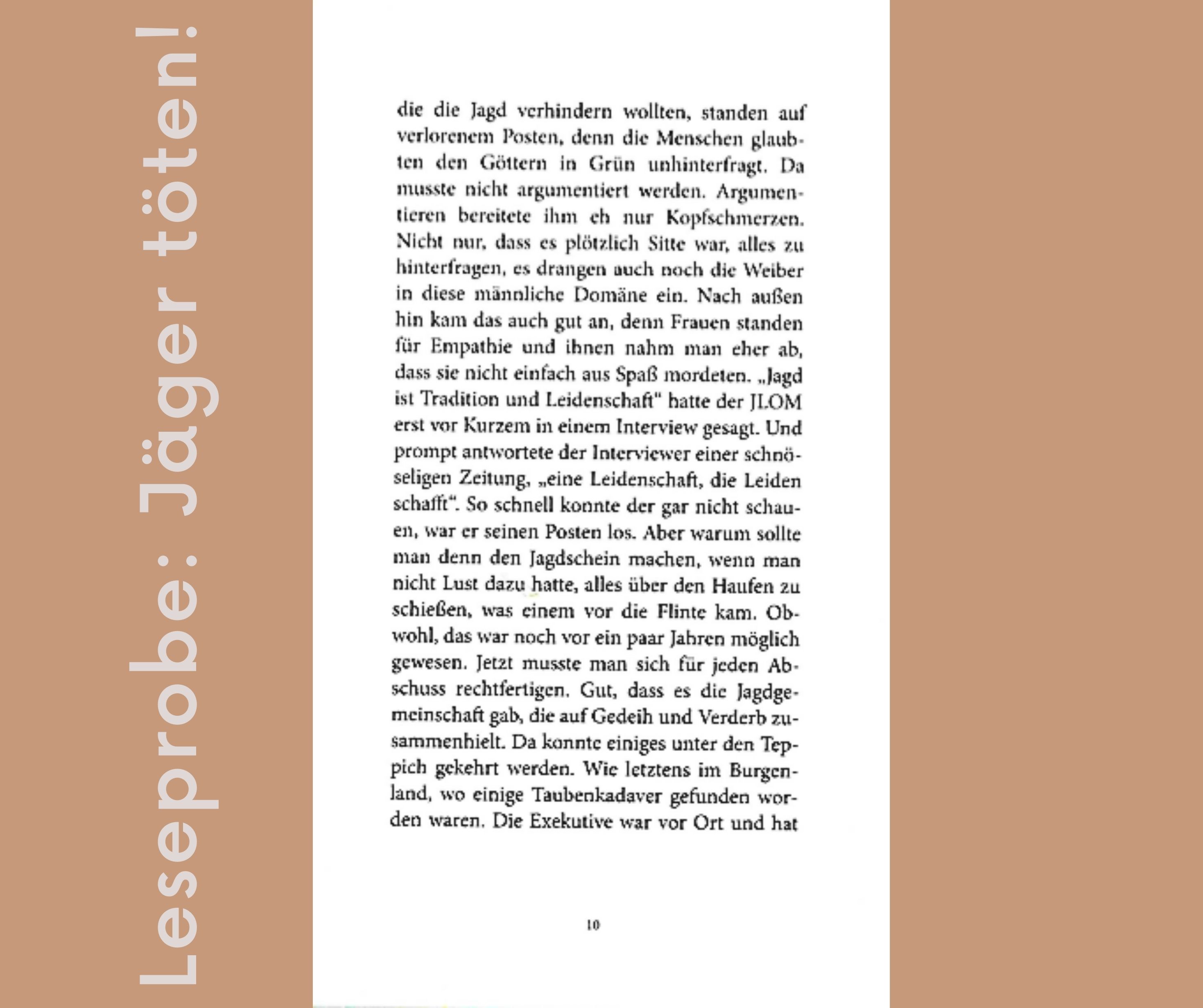 Ein Volksbegehren für ein Bundesjagdgesetz läuft, denn bisher lag die Kompetenz für die Jagd bei den Bundesländern in Österreich. Das bedeutet, neun unterschiedliche Jagdgesetze für so ein kleines Land mit unterschiedlichen Schonzeiten und Gesetzen. Ein Bundesjagdgesetz würde den Wildwuchs eindämmen und auf völlig neue Füße stellen. Die Jagd müsste sich an ökologischen Maßstäben messen lassen. Das sehen die Jäger*innen naturgemüß mit großer Sorge und erwägen dagegen vorzugehen. Eine Strategie besteht darin, einen jungen, unverbrauchten, glaubwürdig erscheinenden jungen Jäger als Aushängeschild für die Erhaltung der Provinzialität des Schießens zu gewinnen.