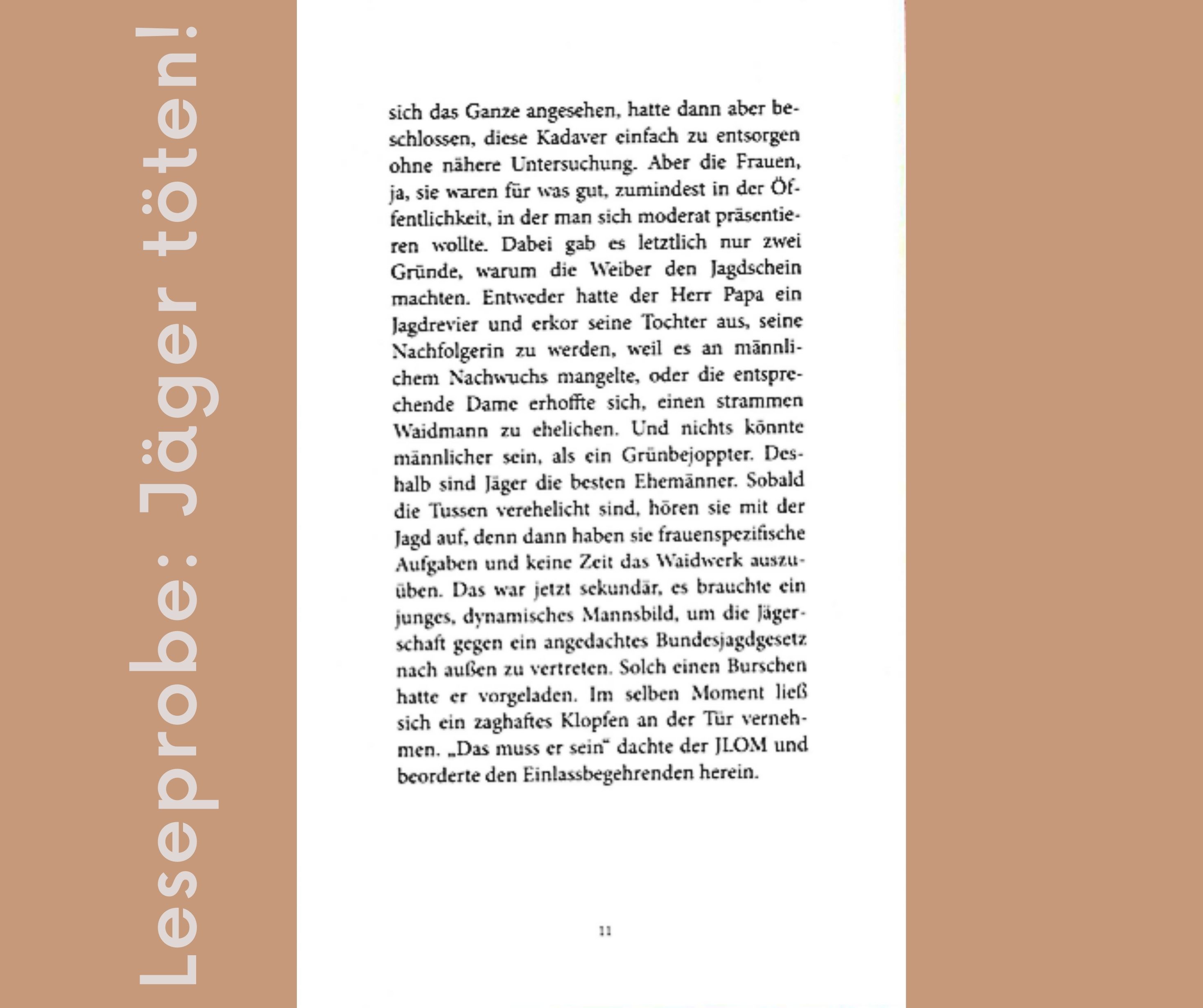 Dieser erscheint im Büro des Jagdlandesobermufti, um sich unterrichten zu lassen, wie er mit den verschiedenen Themen umzugehen hat. Im Laufe dieses Gesprächs kommen die ernsten Bedenken des Altjägers zum Ausdruck, doch das ist nicht die Art, wie man sich in der Öffentlichkeit präsentieren kann, denn da will man als Heger und Pfleger auftreten, die nur im äußersten Notfall und wenn es unbedingt sein muss, schießen. Doch ist der junge Mann tatsächlich der, der er zu sein vorgibt?