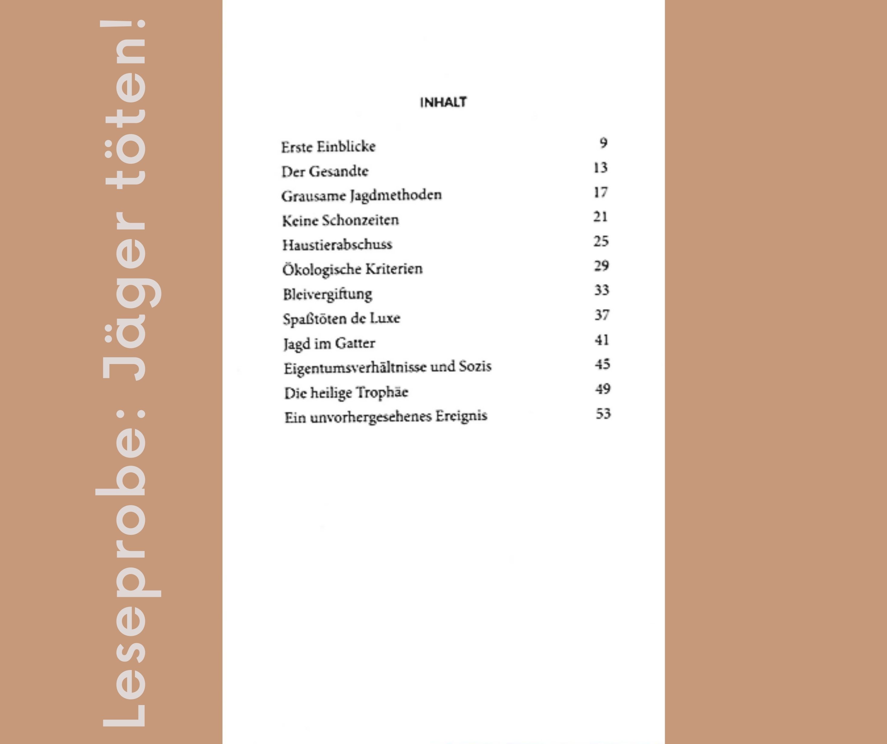 Jäger töten ist ein Buch, in dem die verschiedensten Gespräche und Aussagen von Jägern, die die Autorin geführt bzw. gehört hat, zu einem transparenten Bild zusammengeführt. Von Schonzeiten, dem Abschuss von Haustieren oder für die Jagd gezüchteten Tieren, den grausamen Jagdmethoden wie Baujagd oder Drückjagd, die vorsätzliche Vernichtung von sog. Raubzeug bis hin zur eigenständigen Bejagung von geschützten Arten kommen viele Themen vor, die wohl so nicht für die Öffentlichkeit bestimmt sind. Denn die Wahrheit ist, Jäger töten und sonst nichts.