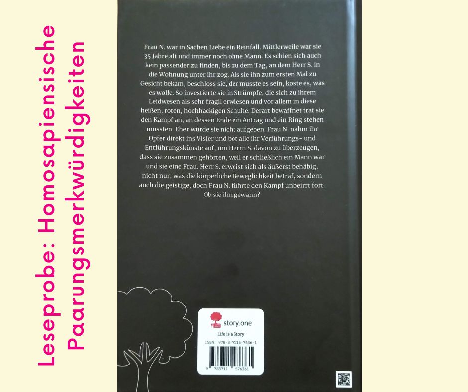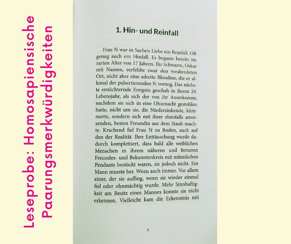 Ein heiter beschwingter, kurzweiliger Roman über die Merkwürdigkeiten des Paarungsverhaltens des Homo Sapiens, als „Homosapiensische Paarungsmerkwürdigkeiten“.