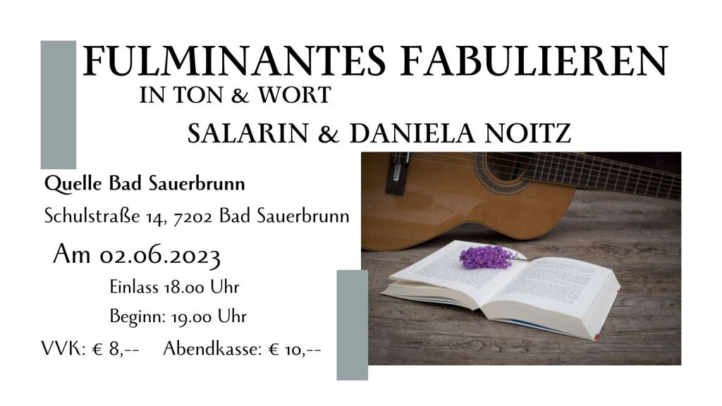 Unsere Gäste sind diesmal die Autorin Daniela Noitz und Musiker Jonny Maccarronny mit einer heiter-satirischen Performance, bei der sich Literatur und Liedkunst ein Stelldichein geben…