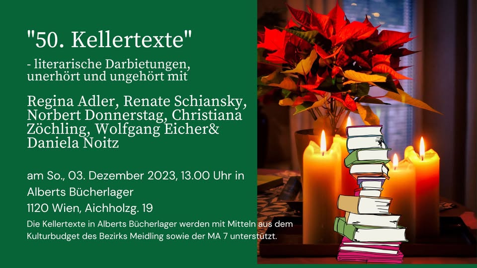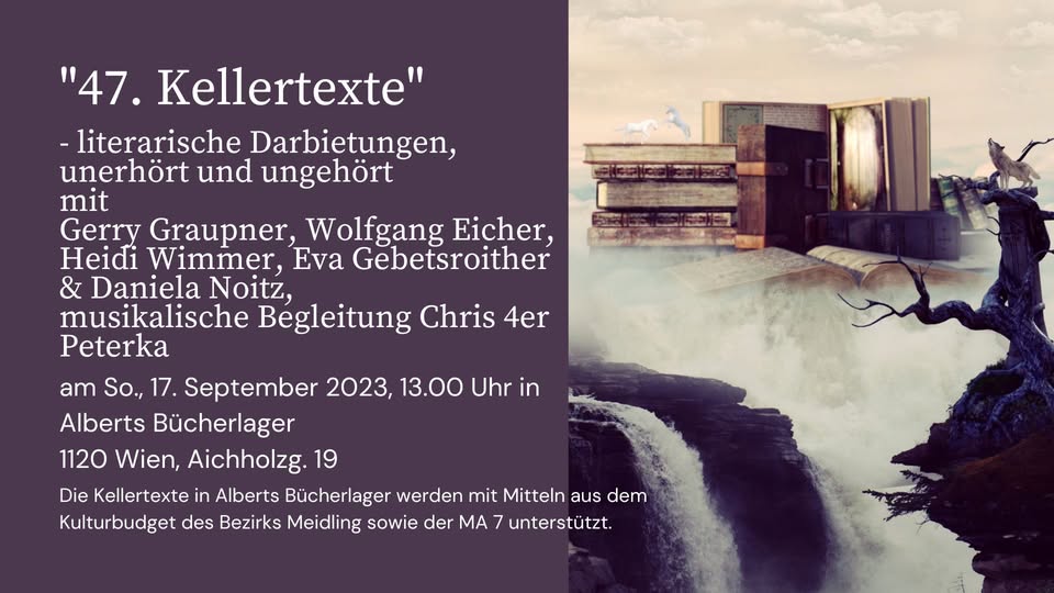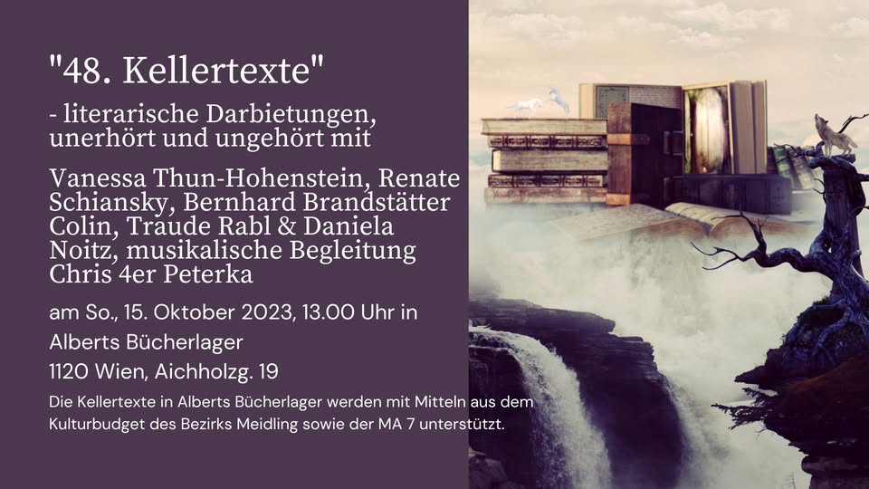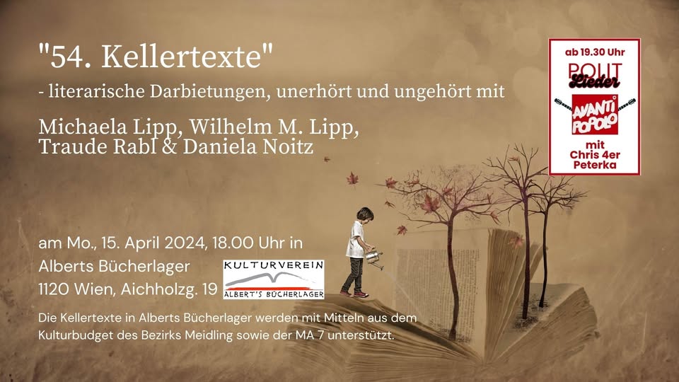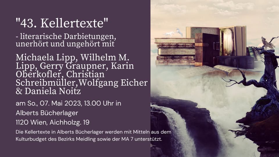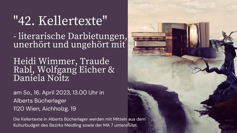 Dem Motto „Appetit auf Kunst“ entsprechend, erwarten Euch Geschichten, die in irgendeiner Weise mit Kulinarik zu tun haben. Die Bandbreite zieht sich von lustig bis lustvoll, von ernst bis schaurig und vielleicht manchem dazwischen. Es verspricht ein interessanter und im wahrsten Sinne des Wortes gehaltvoller Abend zu werden. Ich hoffe, wir sehen uns, in Winden am See im Heiligenkreuzerkeller.