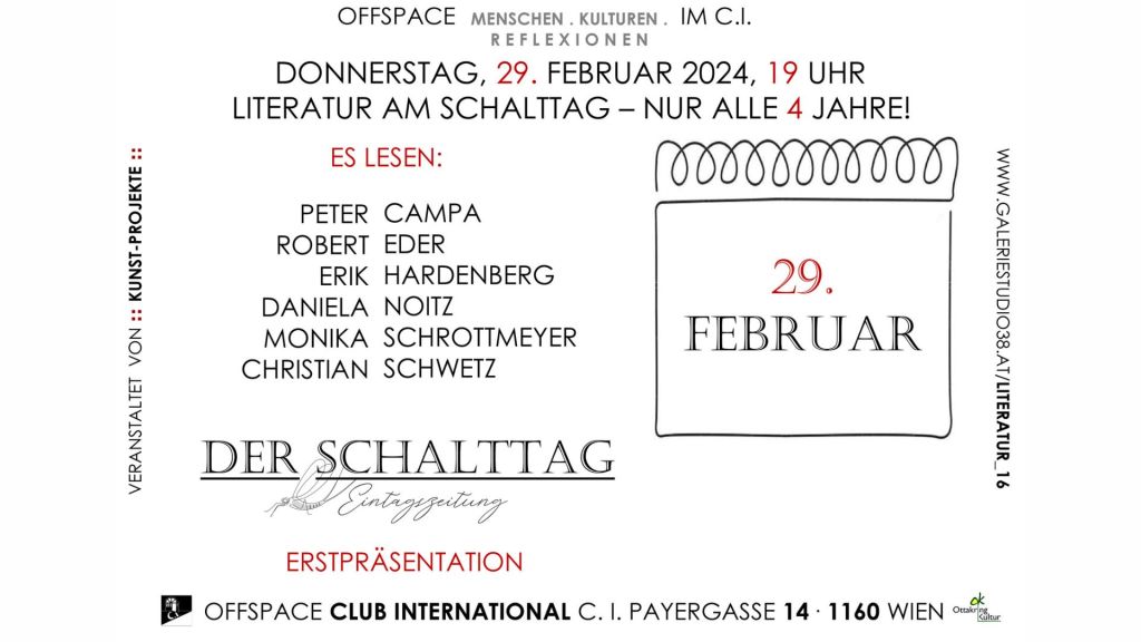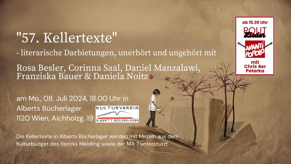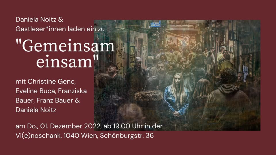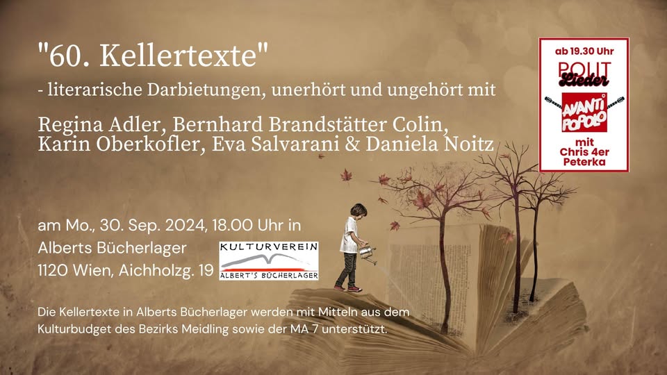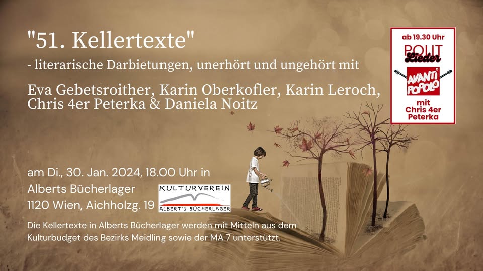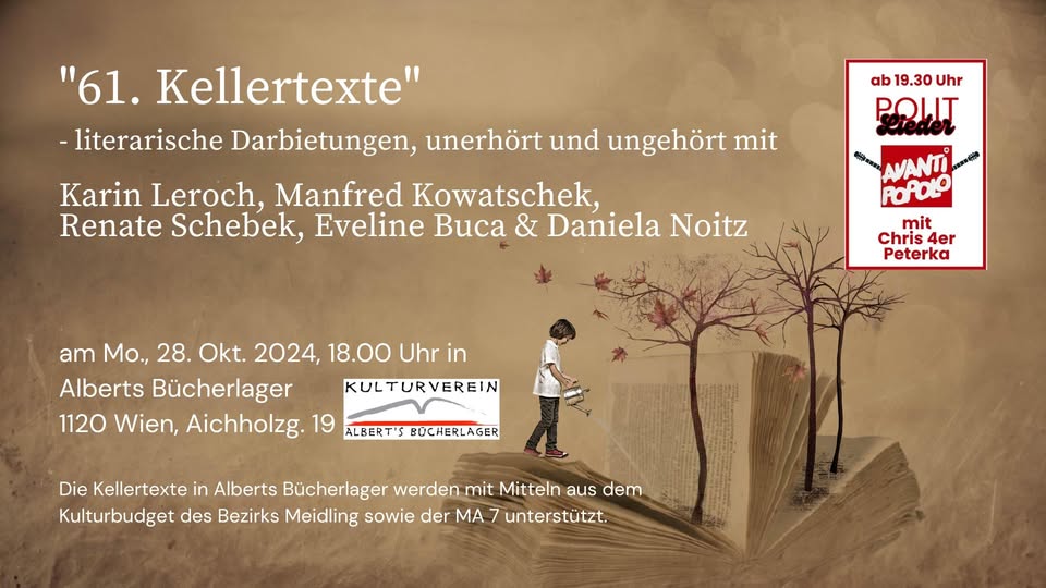 Dem Motto „Appetit auf Kunst“ entsprechend, erwarten Euch Geschichten, die in irgendeiner Weise mit Kulinarik zu tun haben. Die Bandbreite zieht sich von lustig bis lustvoll, von ernst bis schaurig und vielleicht manchem dazwischen. Es verspricht ein interessanter und im wahrsten Sinne des Wortes gehaltvoller Abend zu werden. Ich hoffe, wir sehen uns, in Winden am See im Heiligenkreuzerkeller.